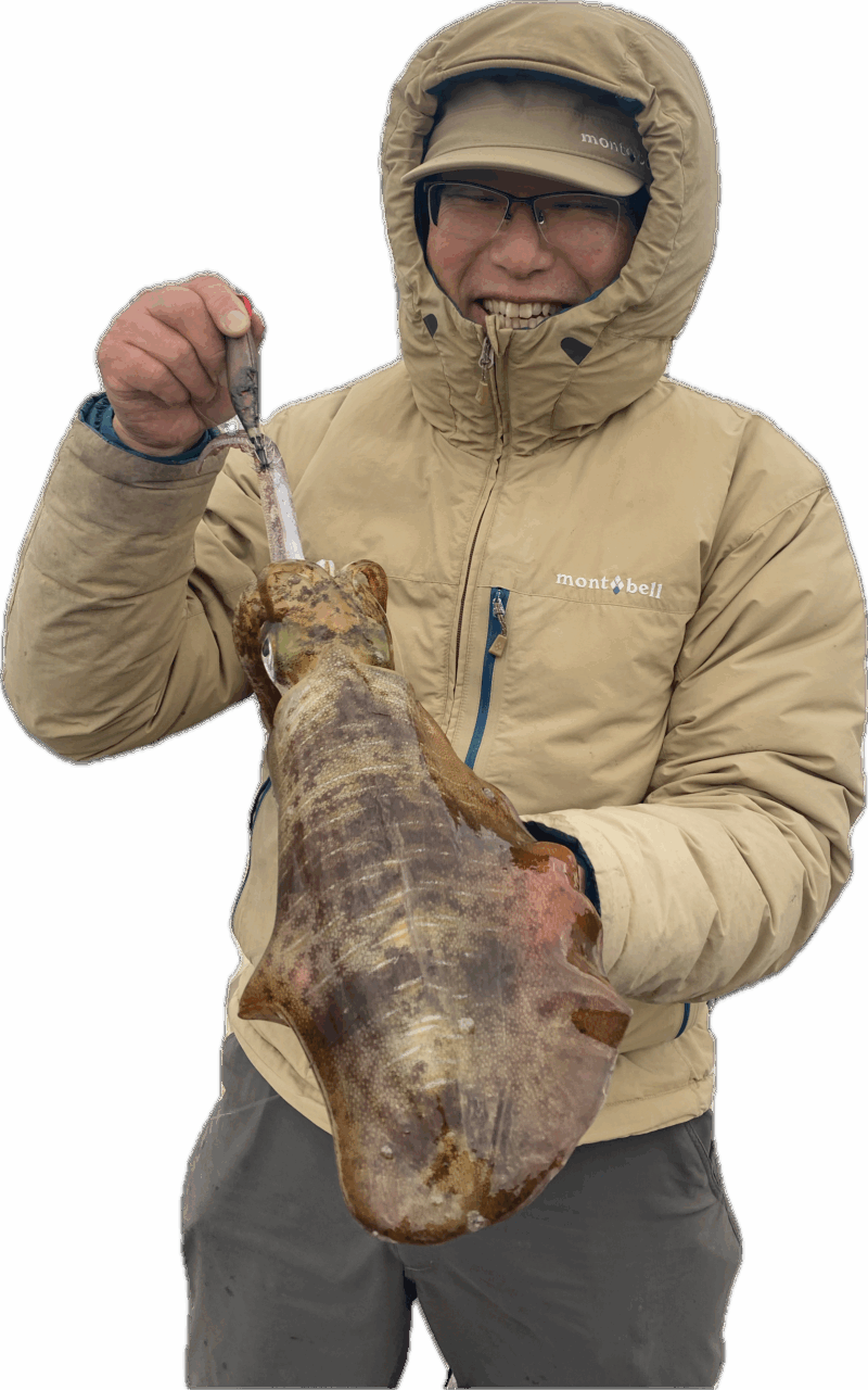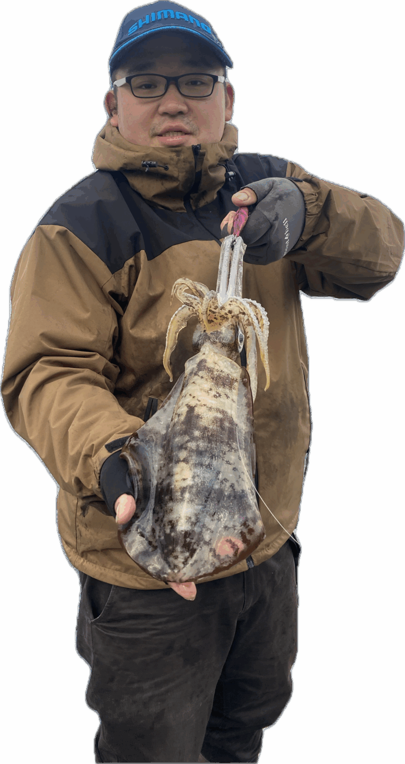 途中で大きいのがいて、海童年間ダービー・アオリイカ部門の暫定1位記録更新する胴長30㎝・重量1.04kgのアオリイカを初挑戦ながら見事にGETしました😊