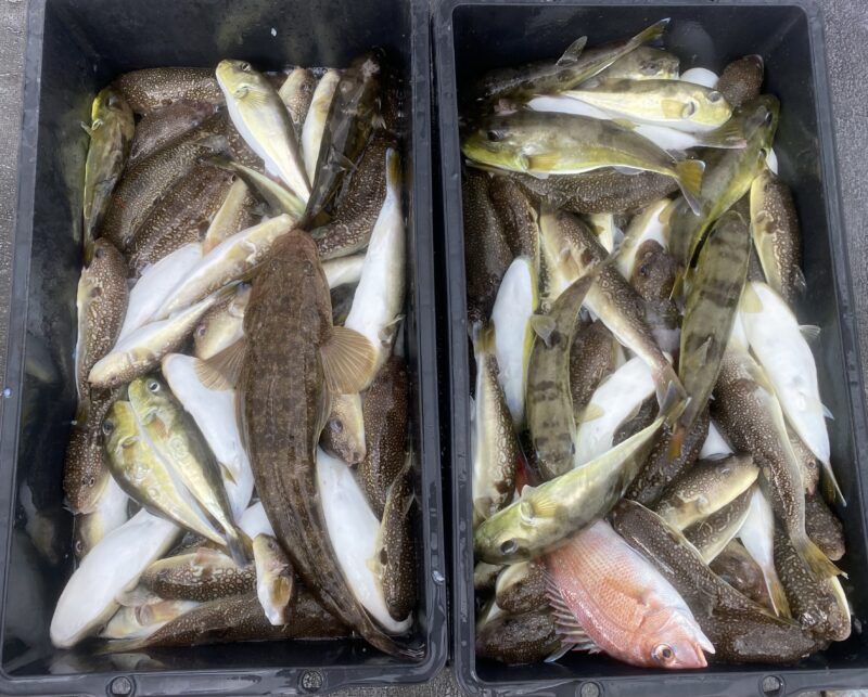 20㎝〜30㎝のショウサイフグや時々サバフグが最後まで(1時間早めの納竿)釣れ続いて1名様あたり20尾〜50尾で『全員つ抜け』です😳