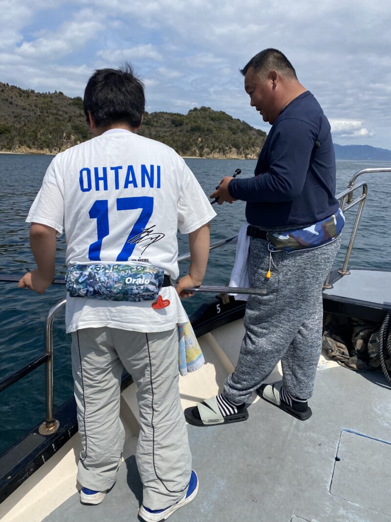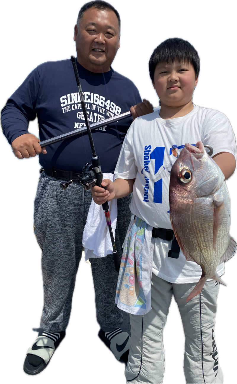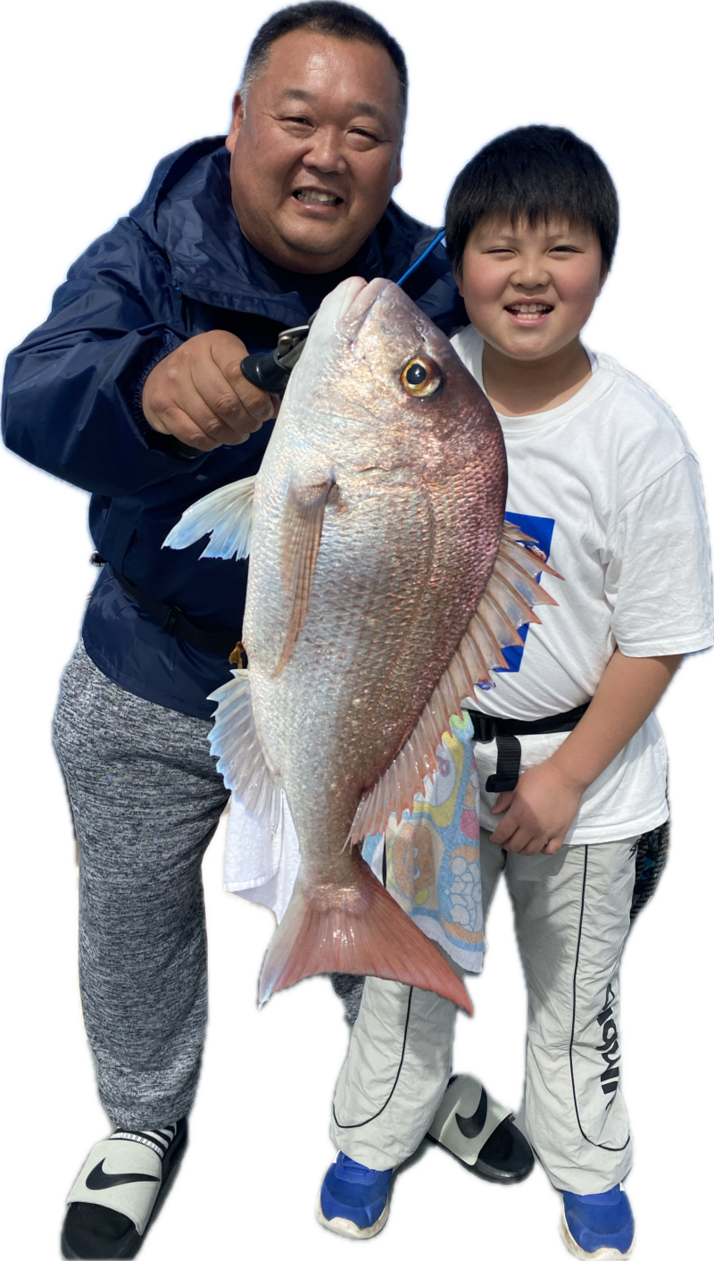 56㎝の真鯛が釣れた時、小学4年生の『オオタニサン』が掬ってくれました😊