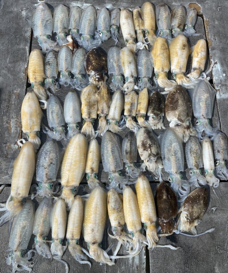 朝から何処へ行ってもパラパラと釣れ続いてくれて総数59杯(ちびアオリイカ2杯・コウイカ2杯リリース含む)でTOP16杯で余裕の『つ抜け』て、他の皆さんも『つ抜け』手前でした🤗